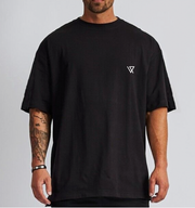 Virtue X shirt is made to create a round, cropped silhouette. Minimalist branding is seen on the front.