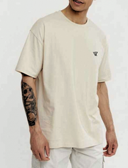 Virtue X shirt is made to create a round, cropped silhouette. Minimalist branding is seen on the front.