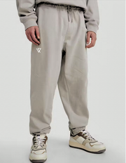 Virtue X sweatpants is made in core fleece and designed with volume to create a round, cropped silhouette. Details include a mock neckline, side seam pockets, rib-knit cuffs, and waist hem. Minimalist branding is seen on the front.